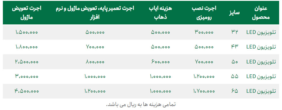 ۷) اجرت تعمیرات محصولات شرکت در خارج از دورهی گارانتی بر اساس نرخنامهی مصوب اتحادیهی هر شهرستان یا استان از مشتری قابل اخذ خواهد بود.